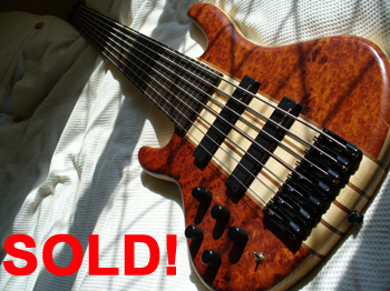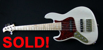 Lefty Fclef Vintage 5 string Hard Ash Body,Transparent White Finish, Tortoise Shell Red pickguard, Seymour Duncan custom single coil pickups, Fodera preamp,Hipshot A style bridge and Tuners, Sugar Rock Maple neck and Fretboard with Pearl Block inlays and binding,Bone nut,this bass is in MINT condition !!! case is included !!! Pictures are available upon request !!! Asking price: $2200.00 US Dollars Contact: bassman24@optonline.net (USA) 05/2009 |