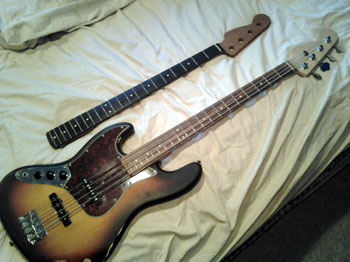 1993 MIJ Lefty Jazz Bass Reliced and sanded down for worn in look and more open sound Price $600 for everything Shipping out of Los Angeles CA 09/2011 |