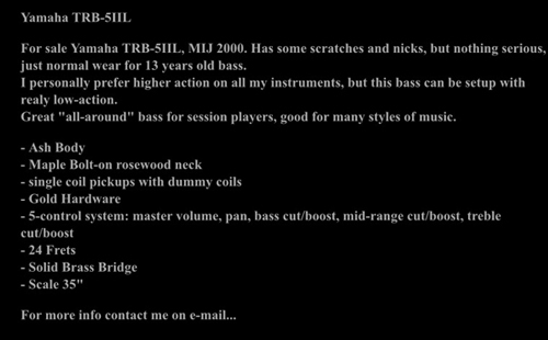 Hier könnt ihr euren Linkshänder-Bass anbieten. Einfach eine Email mit Foto und Beschreibung senden. Ich werde ihn umgehend in das Internet stellen (kostenlos natürlich). Für die Aktualität der Angebote kann ich nicht garantieren. If you like to offer your lefthand bass, please feel free to send me a email with pic and discription. I will publish it asap (for free of course). Sorry, but I can´t proof if these offers are up to date! |